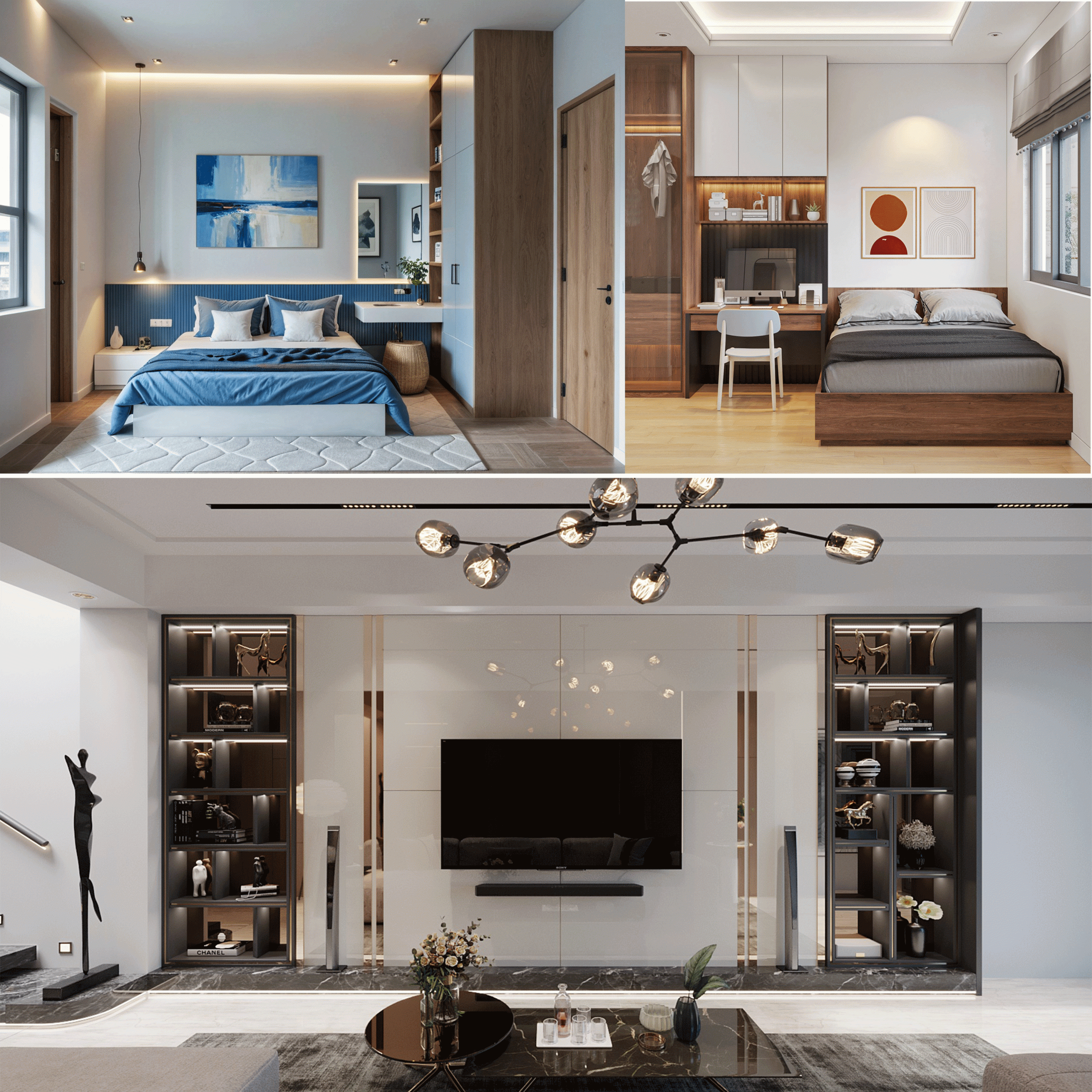 Phối cảnh 3D nội thất các không gian phòng (Là ảnh 3 chiều thể hiện không gian mô phỏng sau khi công trình thi công hoàn thành. Mỗi không gian thể hiện từ 2-3 góc nhìn)