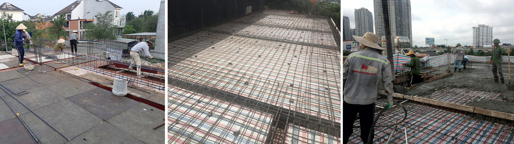 Đổ Bê Tông: Đổ bê tông cho cột, dầm, sàn các tầng, sân thượng, mái, và cầu thang.